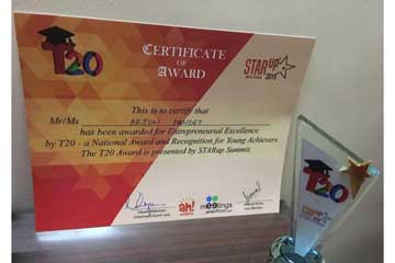 T20 Award was presented for Entrepreneurial Excellence by STARup Summit- A National Award and Recognition for Young Achieveers